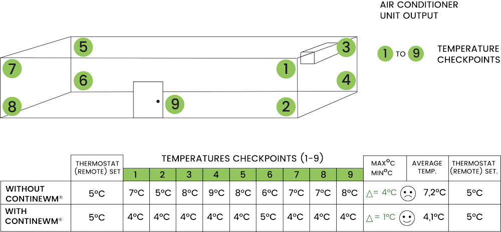 The entire room achieved homogenization of air temperature. The measurement showed a consistent temperature, whether closer or farther from the air conditioner.